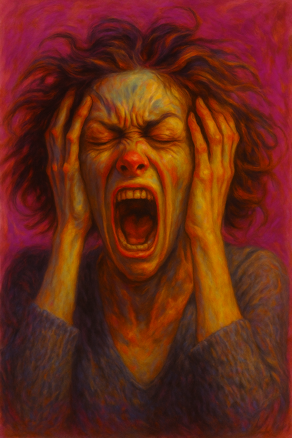De pronto su teléfono empezó a sonar y vibrar como poseso; tenía esa palabra en todas las aplicaciones y cada centímetro de la pantalla. Miriam tiró su teléfono en el suelo y enfiló su regreso mientras el sol empezaba su descenso en la ciudad. En cuanto pasó por la tienda, la pantalla que transmitía la novela coreana de turno cambió de color, la pantalla se difuminó y se asomó el niño con su sonrisa descomunal que la atormentaba gritando «Mami». Salió disparada a correr en la primera dirección disponible, obviando el dolor que sentía en su vientre. Los celulares empezaron a sonar a su alrededor, y cuando la gente contestaba, Miriam escuchaba claramente «Mami». La gente, de pronto, dejó de hablar español, solo se hablaba con una palabra «Mami». Con cada paso que daba, la gente la miraba, y susurraba «mami». Los niños la miraban y reían maquinalmente con esas grandes y deformadas sonrisas gigantes con esos dientes como colmillos y babeando como si quisieran comérsela, llamándola «mami».